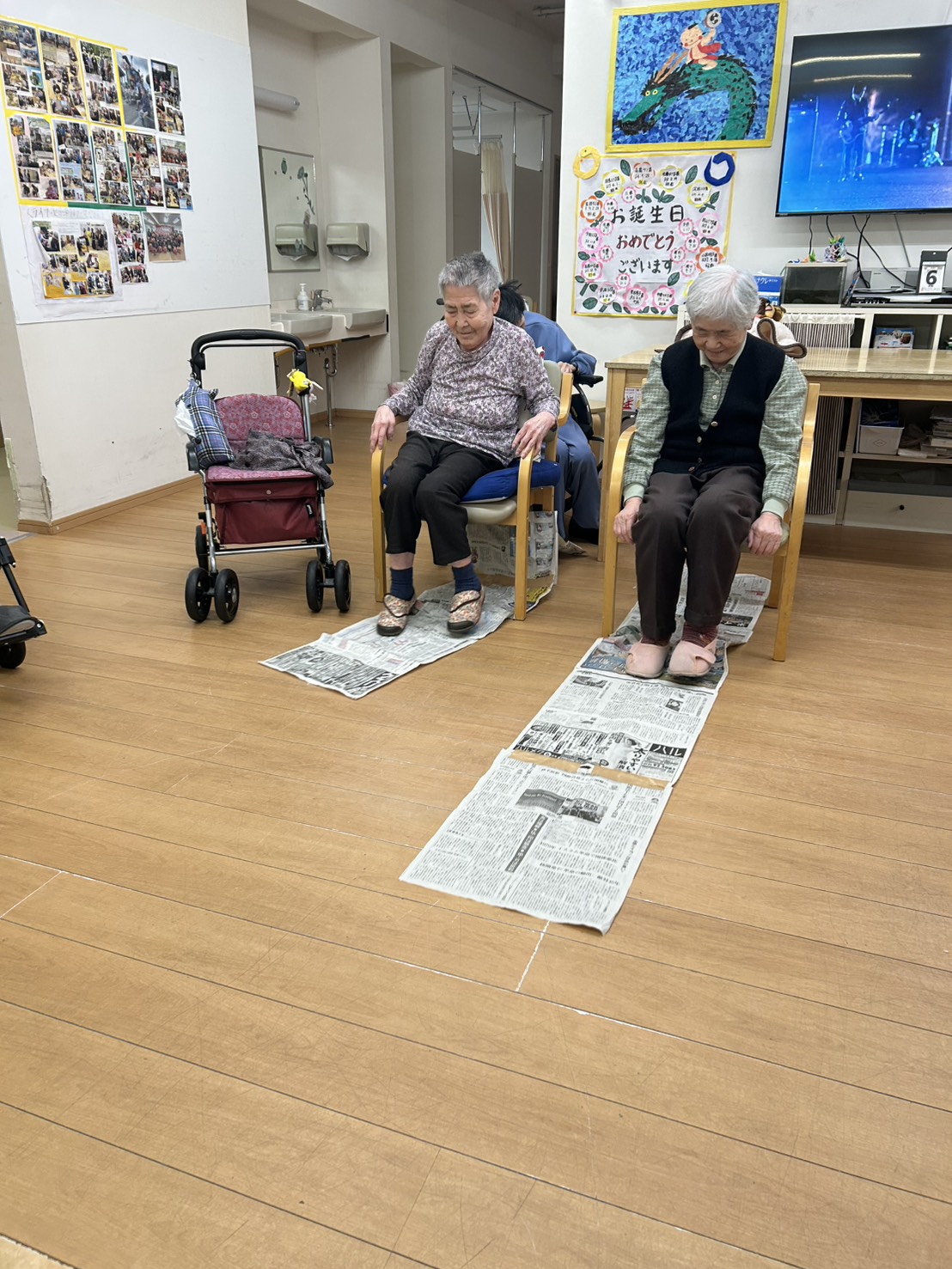 長ーい新聞を足で巻いていくゲームです。素早い足さばきを動画でお見せしたかった(*^^*)普段の生活でこんなに素早く足を動かすことってないですよね。やってみるとなかなか疲れるし良い運動になります。 デイサービス・有料老人ホ […] -