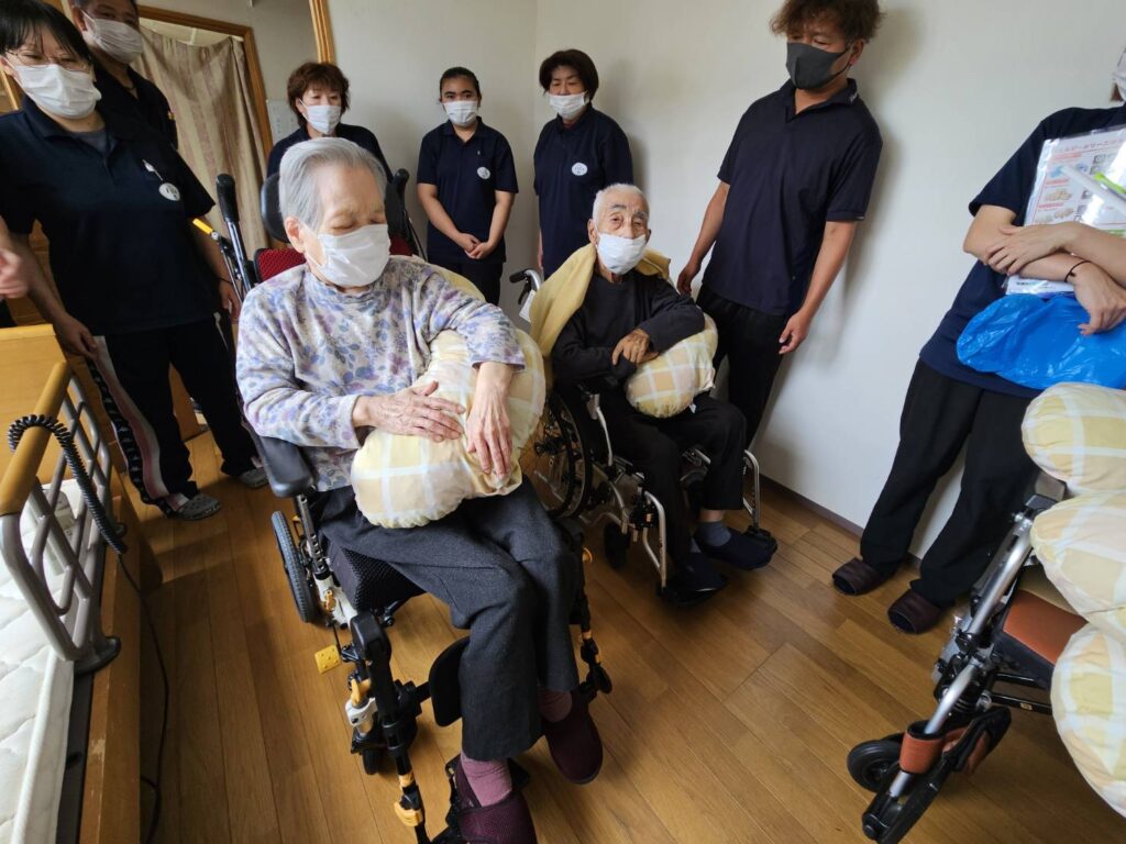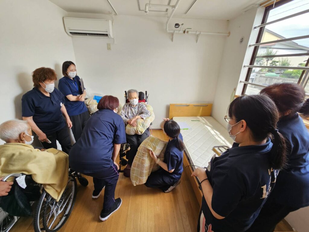 体圧分散による褥瘡予防、体位の安定、食事や呼吸のしやすさなど介護におけるポジショニングはとても重要なものです。正しいポジショニングの再確認や新たな知識を得るために蔵王サプライズ様に来ていただき講習会を行いました。ライフ、セカンドライフ、マイライフの職員が集まり、法人全体として介護技術の底上げを図ります。