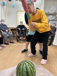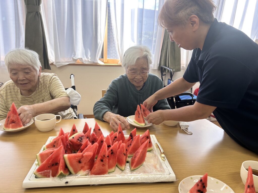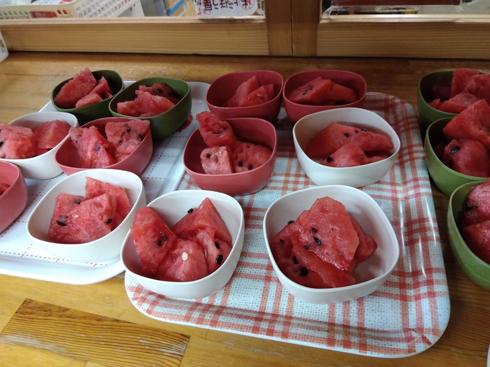 豪快にテーブルの真ん中にドンッ!とご提供のセカンドライフ(上の写真)と、小鉢にカットしてご提供のマイライフ(下の写真)。各施設で個性がでますね。毎年ご家族や職員からたくさんの差入れがあります。ありがとうございます。
