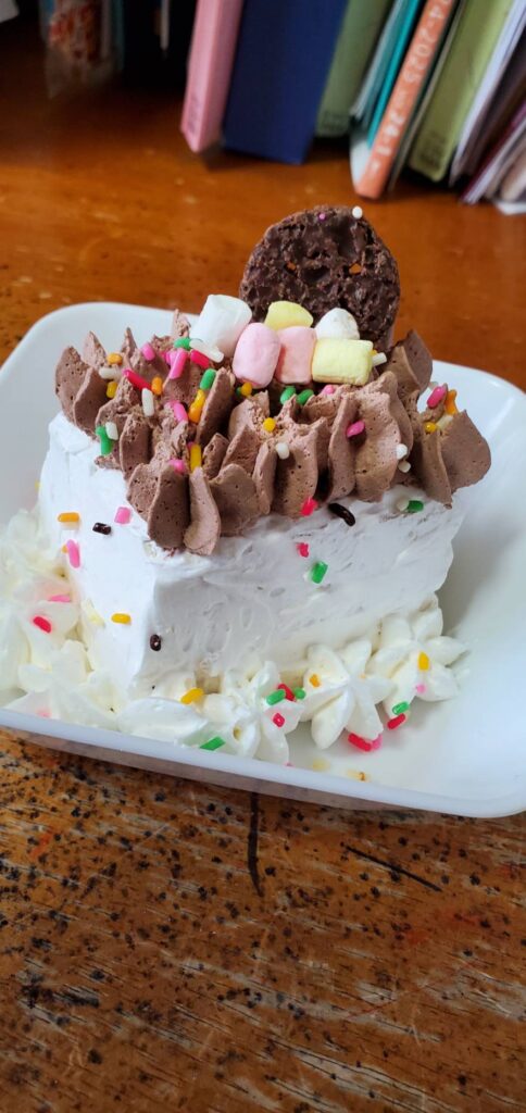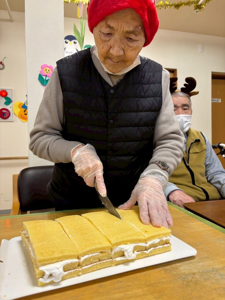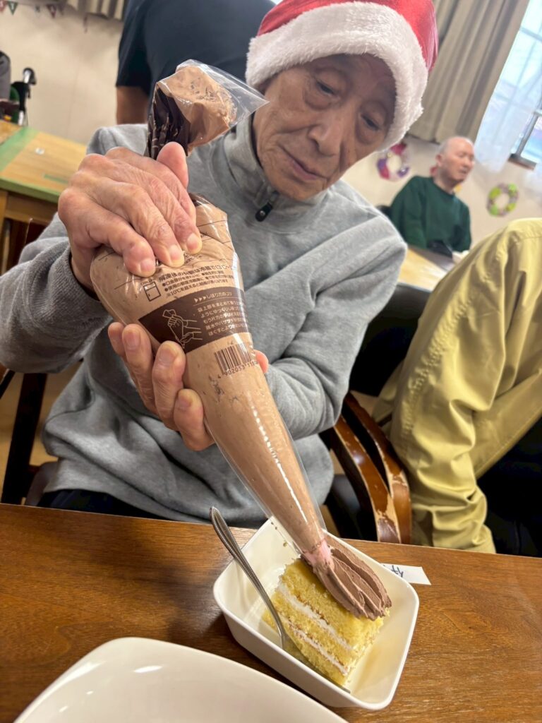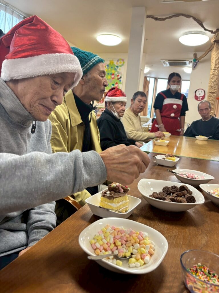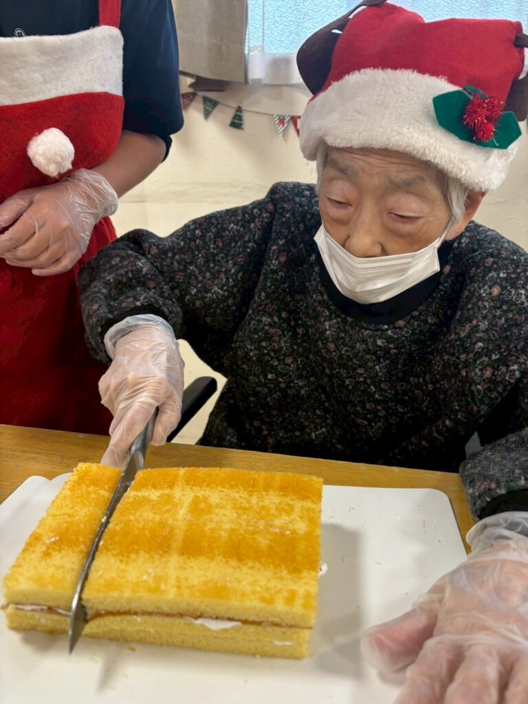 こちらは利用者様がケーキ作りです🍰カットした後は各自お好きなものをトッピングして召し上がっていただきました。刃物も安全に使っていただいておりますのでご安心ください。