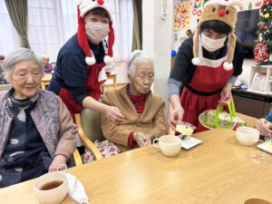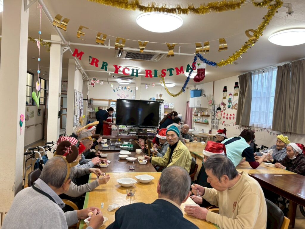 先日高校生が来所したときには、利用者様と生徒さん、職員合わせると80名以上が施設内でワイワイと楽しみ、まるでクリスマスパーティのようでした。ということで今年2回目のクリスマスパーティ。楽しいことは何度あってもいいですね(*^_^*)