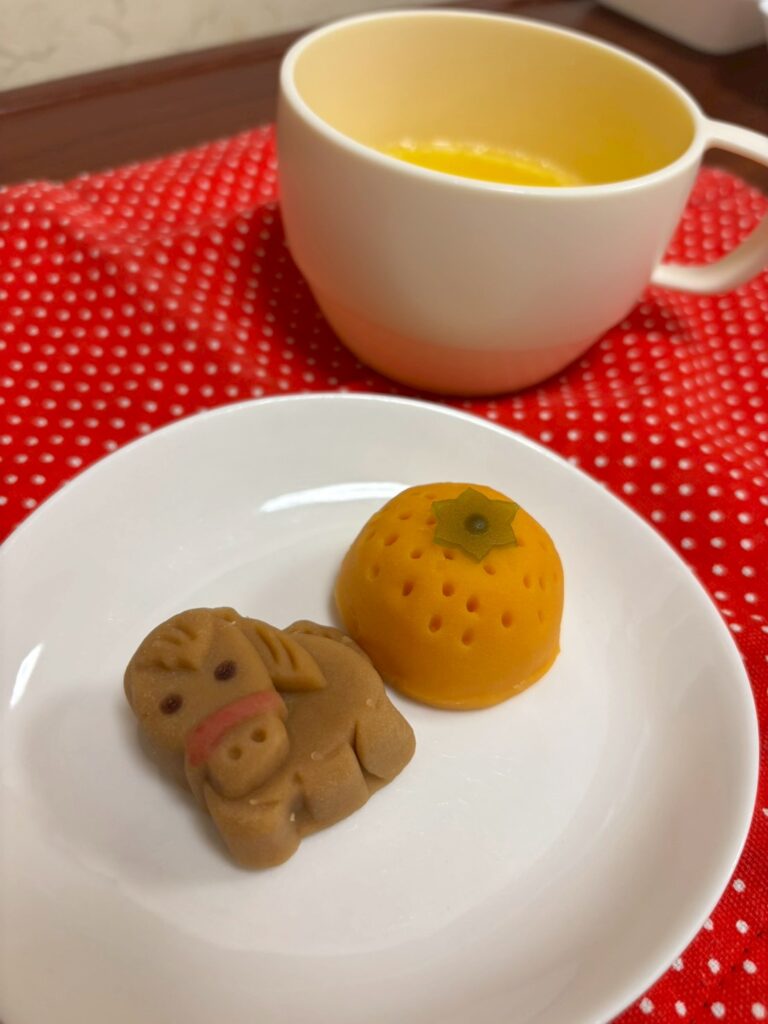 おやつには干支の和菓子です。今年は丙午ですね。丙午の女は気性が荒いなどの迷信から60年前の午年の出生率はとても低かったようです。その年生まれの方は受験や就職に有利だったのかしら~??今はそんなこと関係なく出生率が…。