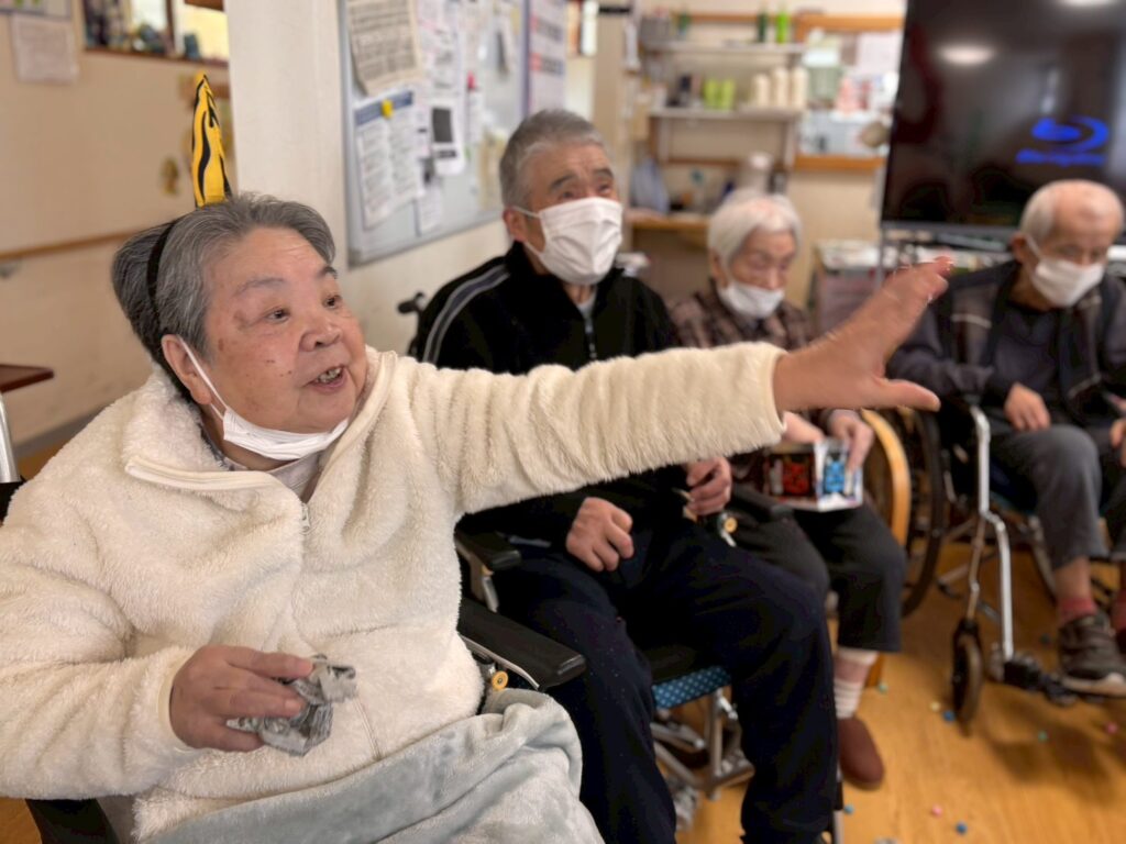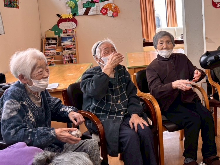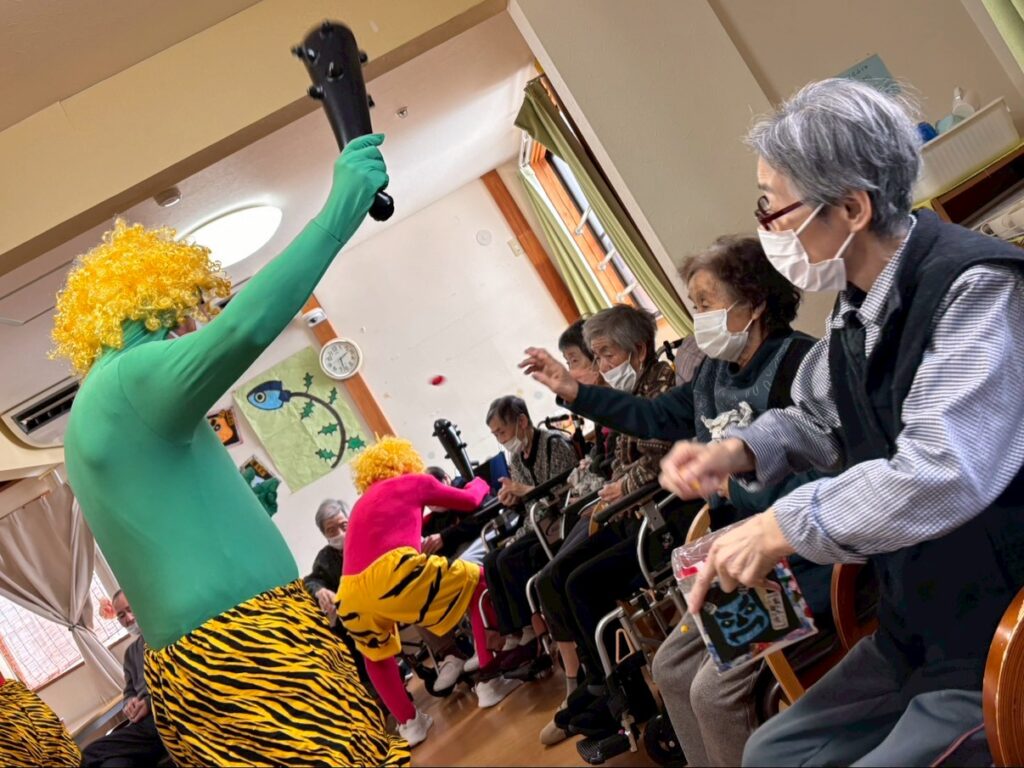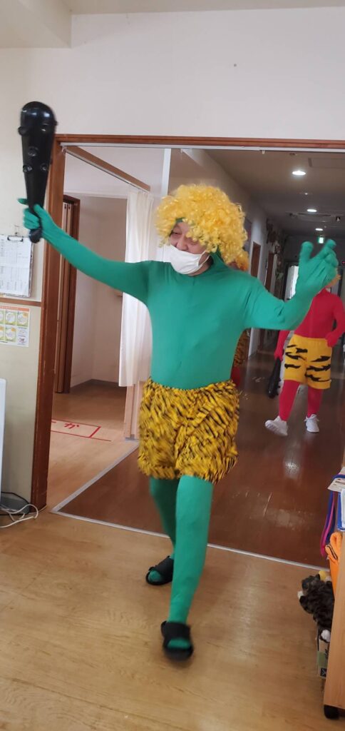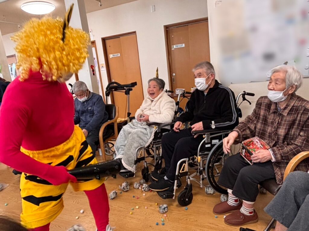 円になって鬼の襲来を待ち伏せ、一斉に豆もどきを投げつけます。容赦はしません(/・ω・)/。。。おや?今年は青鬼さんと黄鬼さんがいませんね。去年やつけてしまったからでしょうか。体(全身タイツ)がボロボロでしたから💦